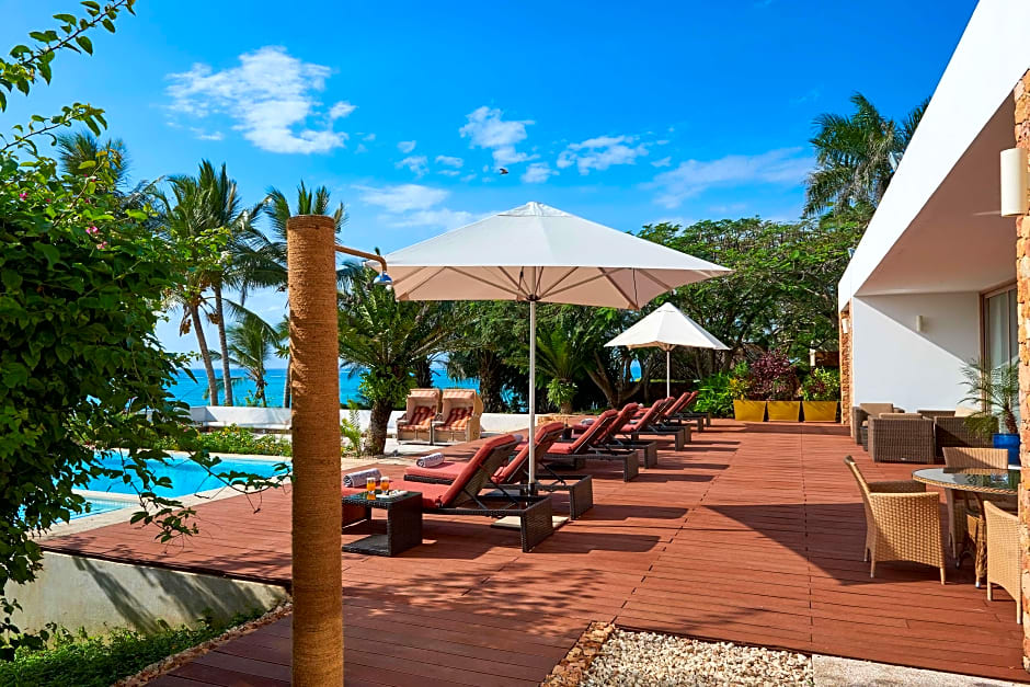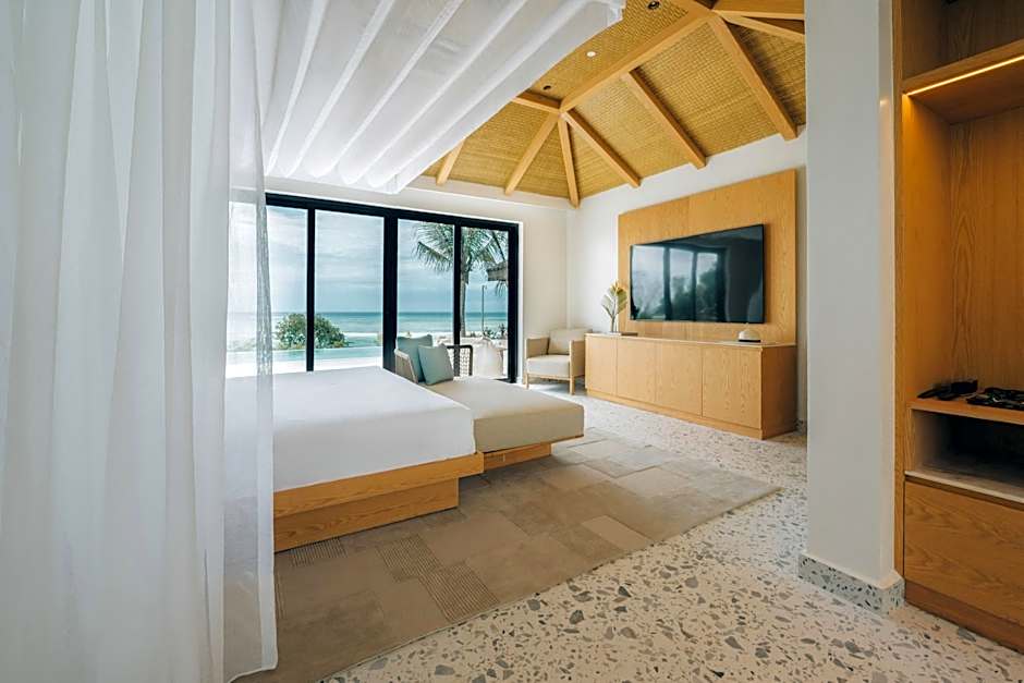 With 3 private bathrooms and bathtub, this villa also comes with a kitchen and separate living room with dining table. It also features a garden area with a private infinity pool with a solarium with sun beds where guests can relax and enjoy ocean views.