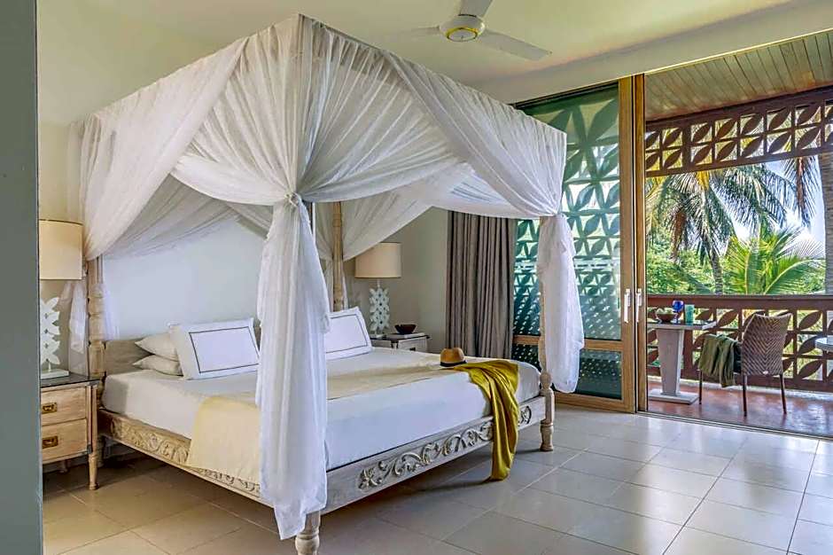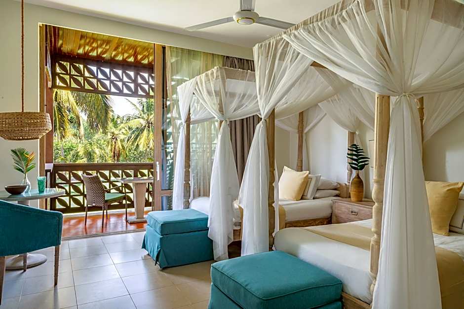 This first floor room includes a carved 4-poster bed with mosquito net and a seating area with cable TV and mini-bar. Surrounded by the tropical gardens and with partial views of the Indian Ocean, it features a furnished private balcony. The spacious private bathroom has a free-standing bath tub and outdoor rain shower.
