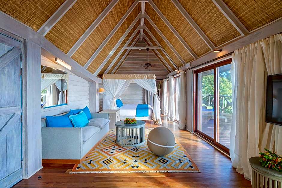 With 3 private bathrooms and bathtub, this villa also comes with a kitchen and separate living room with dining table. It also features a garden area with a private infinity pool with a solarium with sun beds where guests can relax and enjoy ocean views. Extras include: -Butler Service